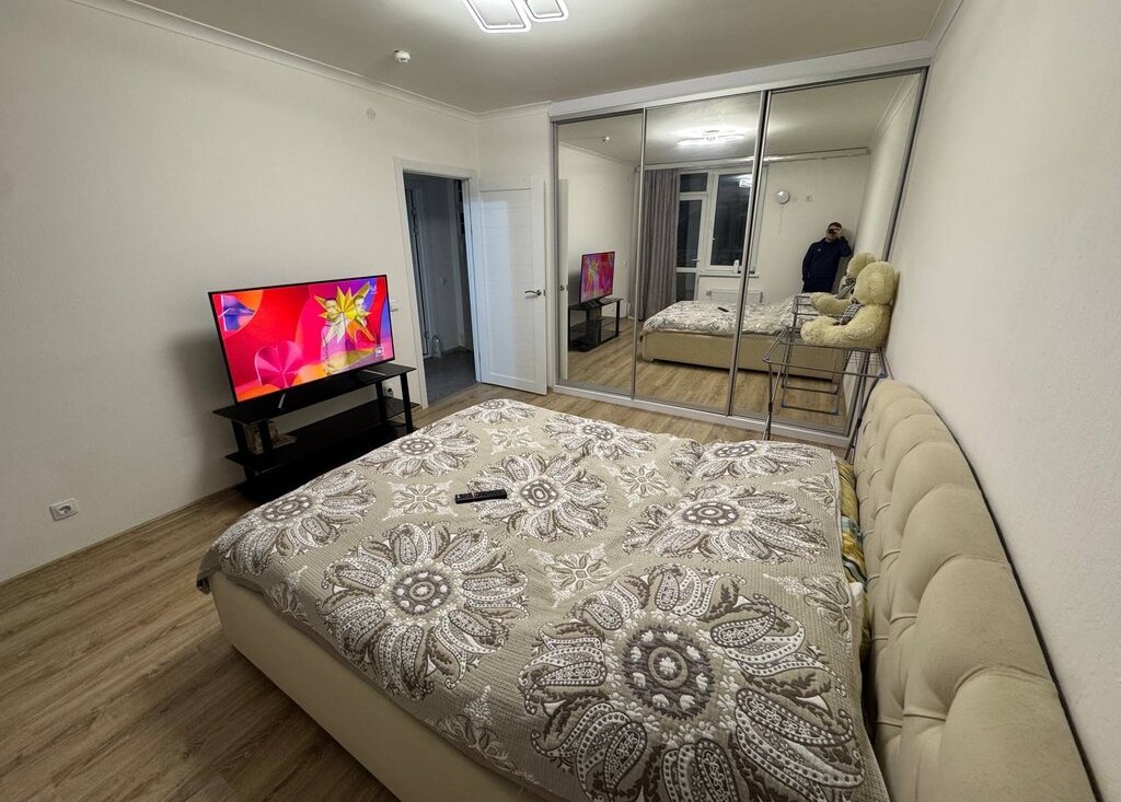 Просторная кухня оснащена необходимой бытовой техникой, включая холодильник, посудомоечную машину, плиту и микроволновку. В комнате установлен телевизор с кабельным/цифровым ТВ. Из мебели имеются шкафы и кровать.