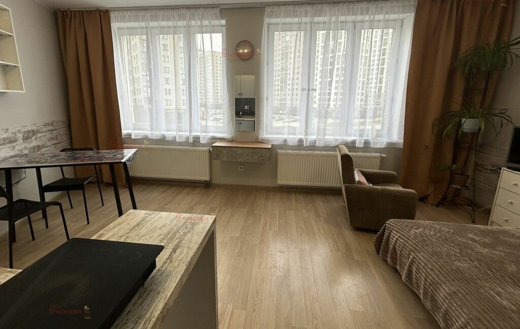 Объект № 198753. Полностью оборудованная студия, с кухонным гарнитуром, двуспальной кроватью, креслом, шкафом, телевизором, стиральной машиной. Чистая, светлая. Для молодой пары или одинокого человека. Показ в любое удобное для вас время.