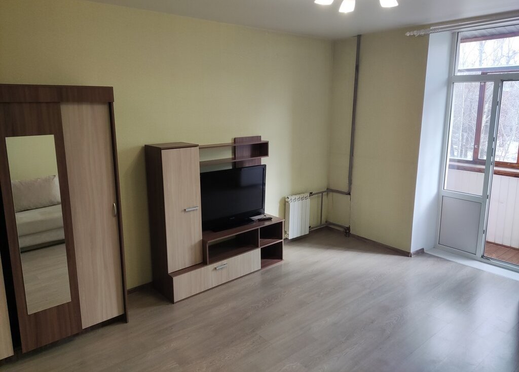 - Комната: раскладной диван (2 спальных места), шкаф для вещей, комод и стенка под телевизор. Телевизор в наличии.