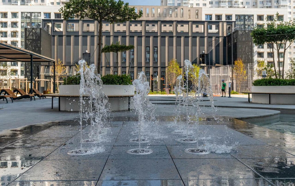 . Закрытый двор с фонтаном и зоной отдыха, детская площадка, поле для спортивных игр.