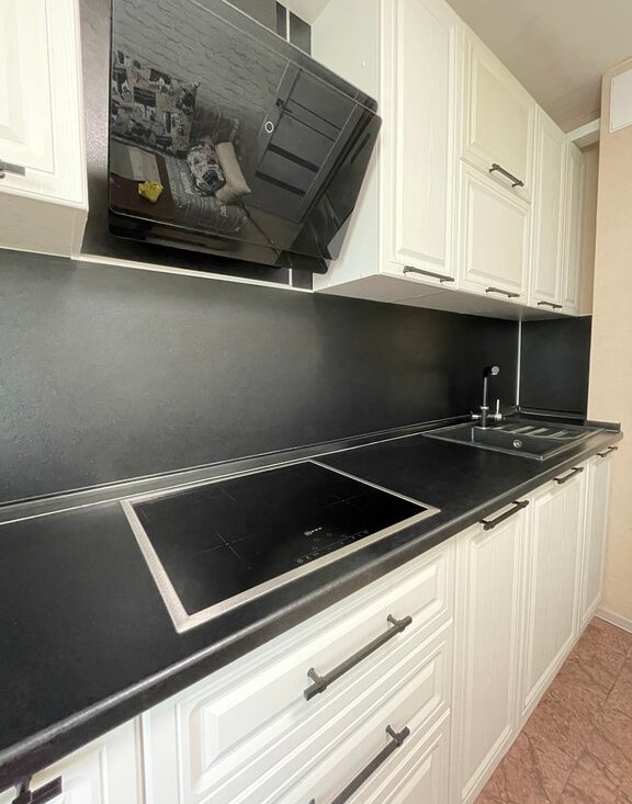 * кухня, изготовленная по индивидуальному заказу с удобными рабочими зонами. Столешница завышена, что делает процесс приготовления пищи очень комфортным;