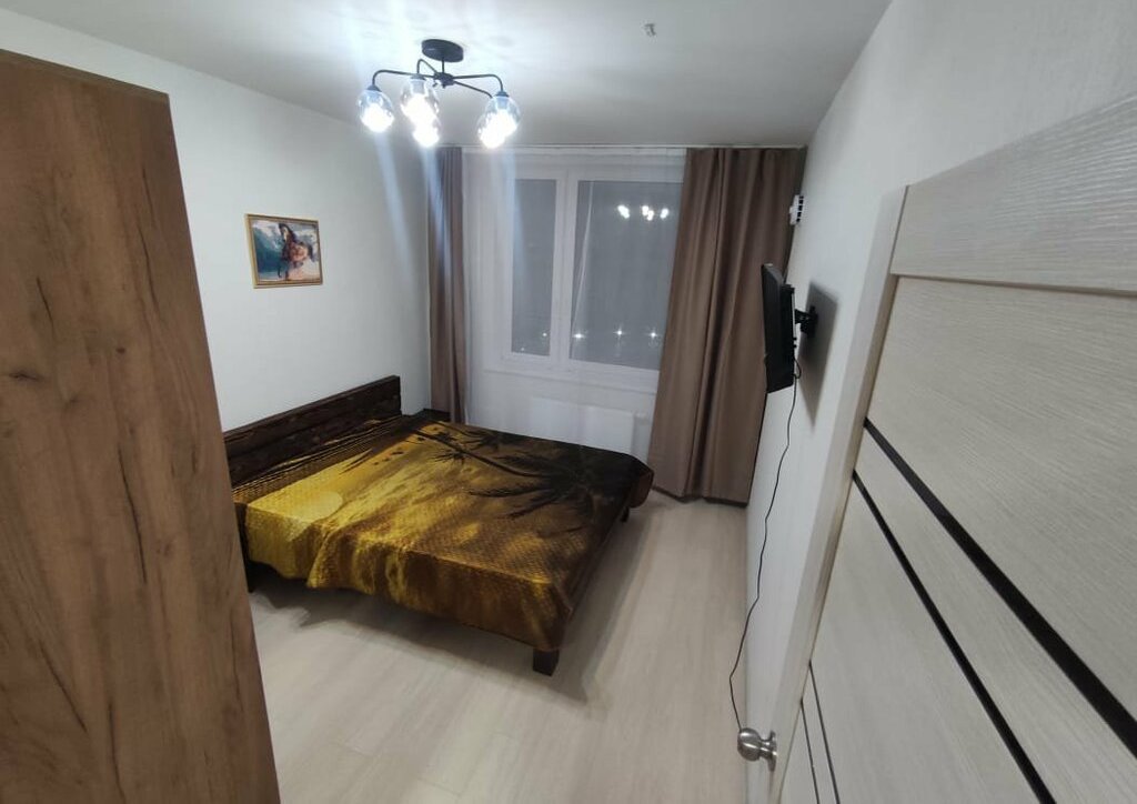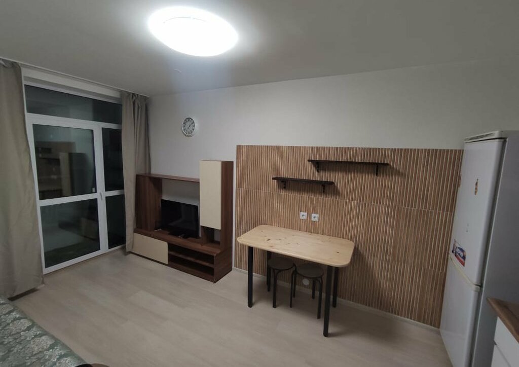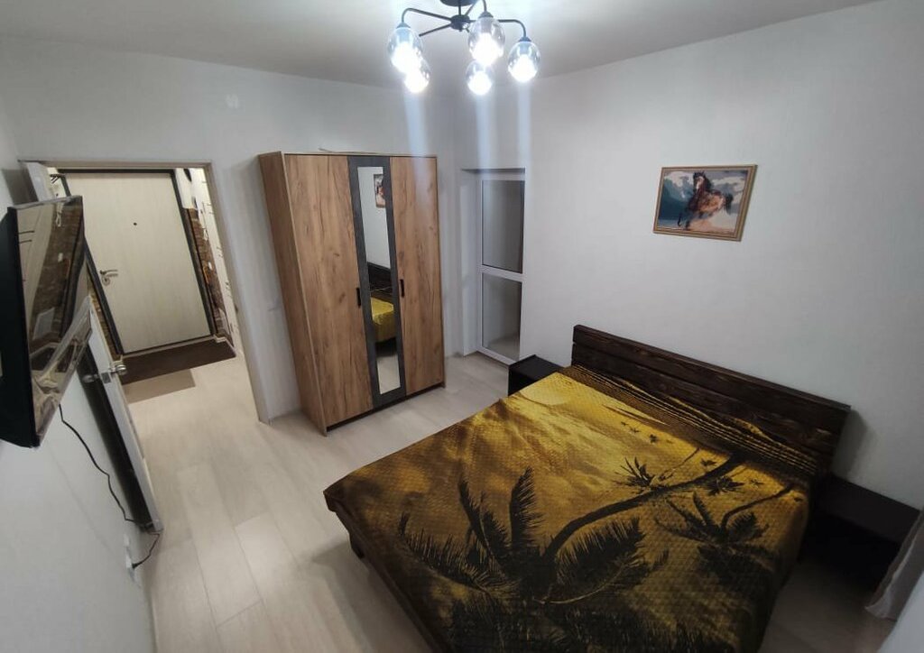 В квартире сделан косметический ремонт. Стоит вся техника для комфортного проживания (холодильник, 2 телевизора, варочная поверхность, чайник, микроволновка, душевая кабина, стиральная машина). Жилая комната имеет двуспальную кравать, шкаф, телевизор. В кухне-гостиной куханный гарнитур, стол и стулья, диван, телевизор.