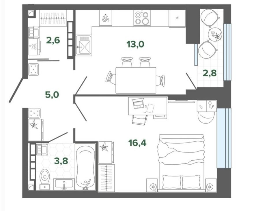 Есть вся необходимая мебель и бытовая техника
