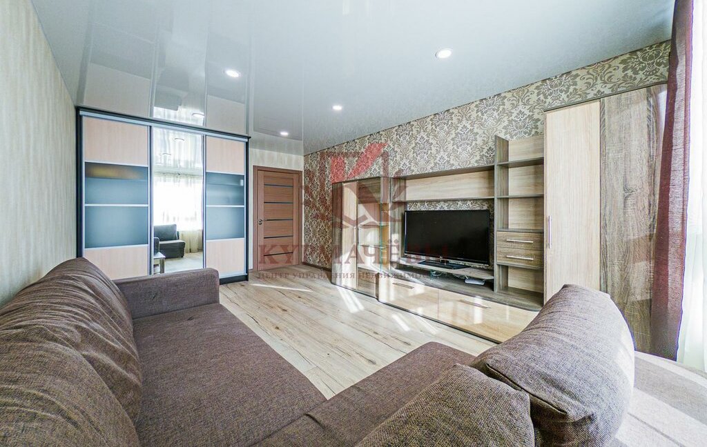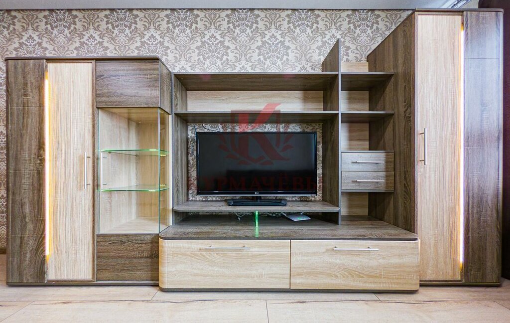 - В комнате: большой угловой диван, шкаф стенка под телевизор с телевизором, вместительный гардеробный шкаф. Имеется еще один гардеробный шкаф в коридоре.