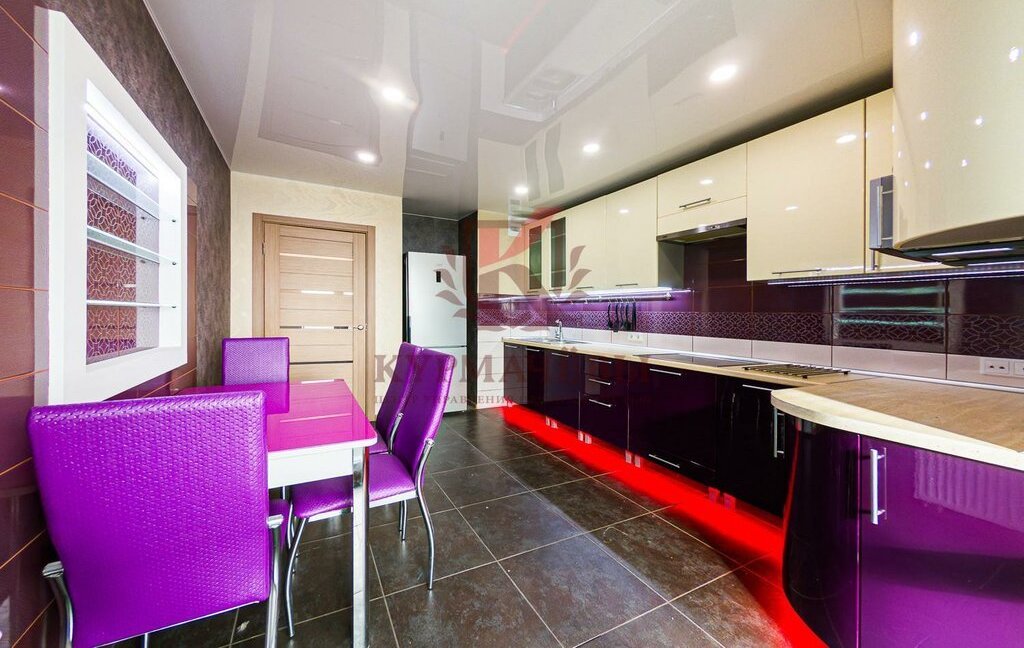 - Кухня оборудована: кухонный гарнитур с подсветкой, большой двухкамерный холодильник, варочная поверхность, вытяжка, микроволновая печь. Имеется обеденный стол и стулья.