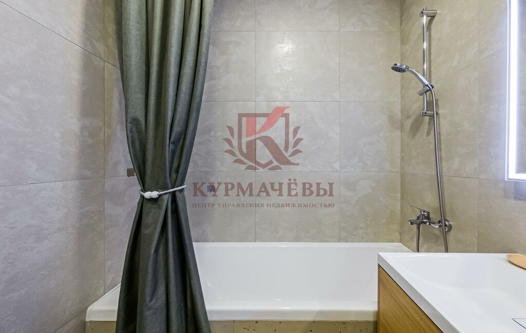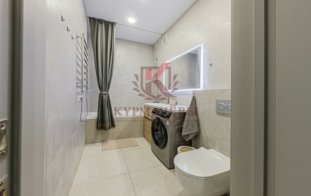 3) Сан. узел в плитке совмещенный, в котором имеется: система теплый пол, стиральная машинка, унитаз, ванная с душем, тумба с раковиной и смесителем, зеркало с подсветкой и полотенцесушитель.
