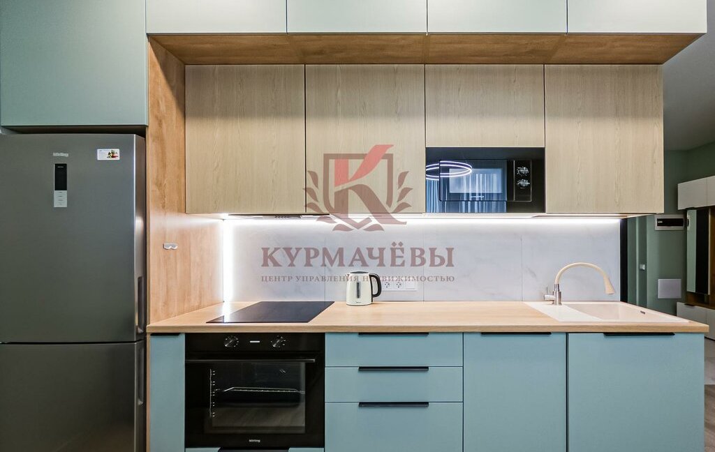 2) Кухня-гостиная оборудована: посудомоечная машина, электрическая варочная поверхность, духовой шкаф, вытяжка, холодильник, микроволновка, чайник, кухонный гарнитур с подсветкой, раковиной и смесителем, обеденный стол и стулья, раскладной диван, вместительная тумба под ТВ.