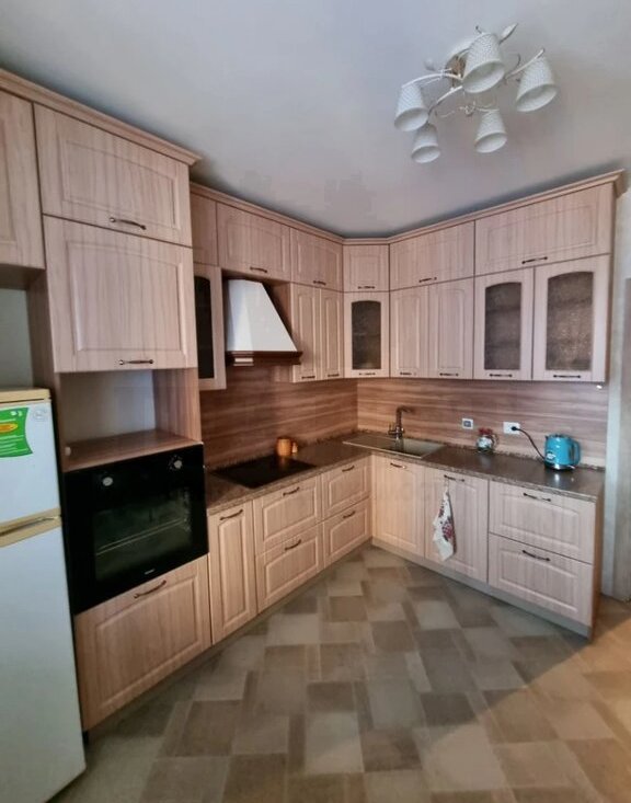 Отдельная кухня со всей необходимой техникой: посудомоечная машина, духовой шкаф, варочная поверхность, вытяжка, чайник.