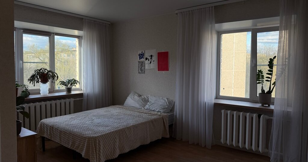 В комнате два больших окна. Есть вся необходимая мебель и техника