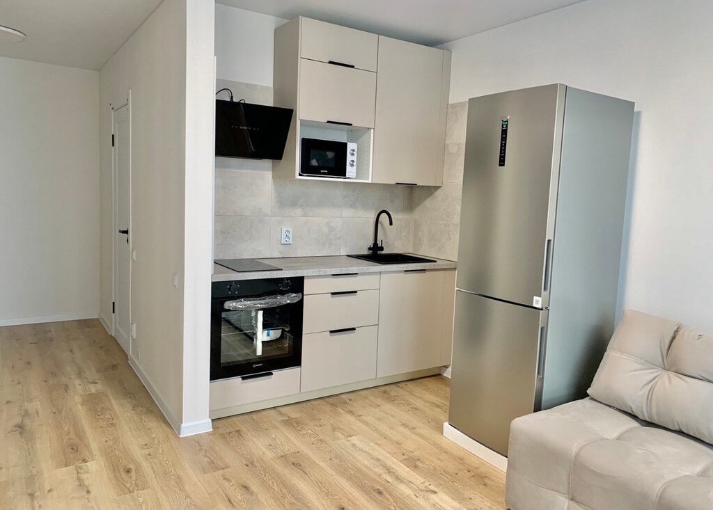 Кухня(14,3 кв.м) - Холодильник,микроволновая печь ,встроенная кухня,уютный диван..(обеденный стол и стулья ожидаем).