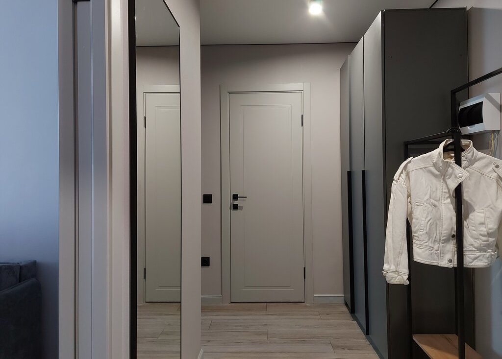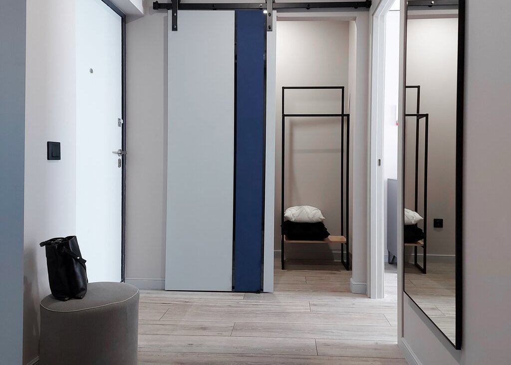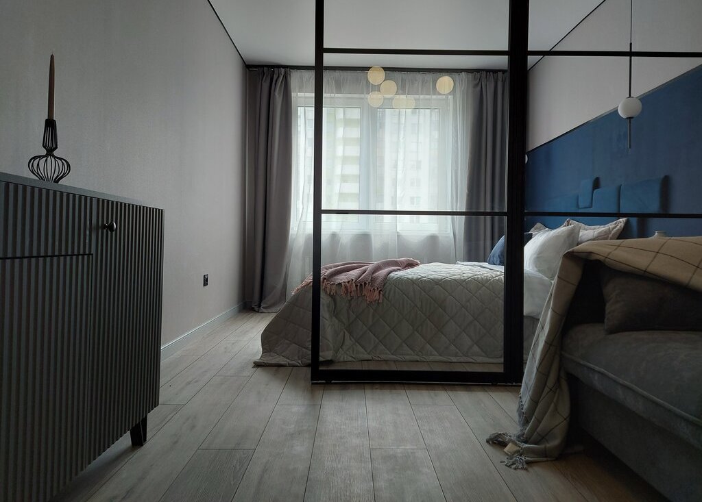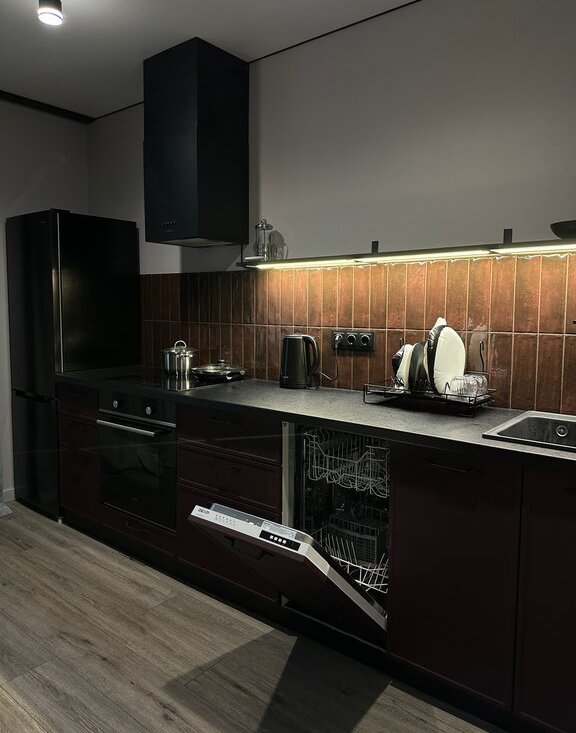 Квартира имеет мебель и технику для жизни: кровать двухспальная, диван, кухонный гарнитур с встроенной техникой, посудомоечная машина, стол и 2 стула, шкаф, гардеробная, на балконе релакс зона с подвесной качелью.