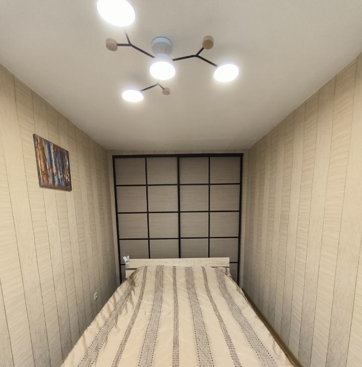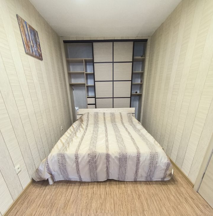 Кровать в спальне и встроенный шкаф. Небольшой диван в зале, плюс шкаф.
