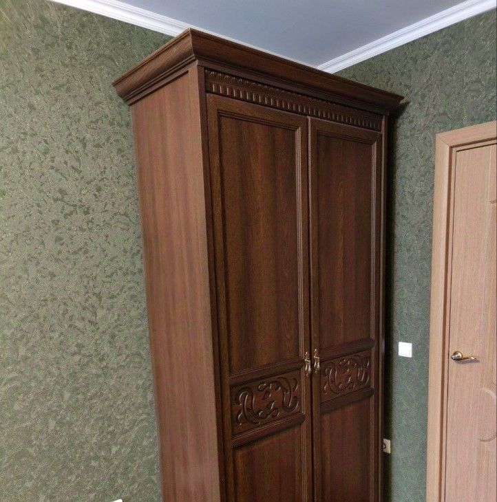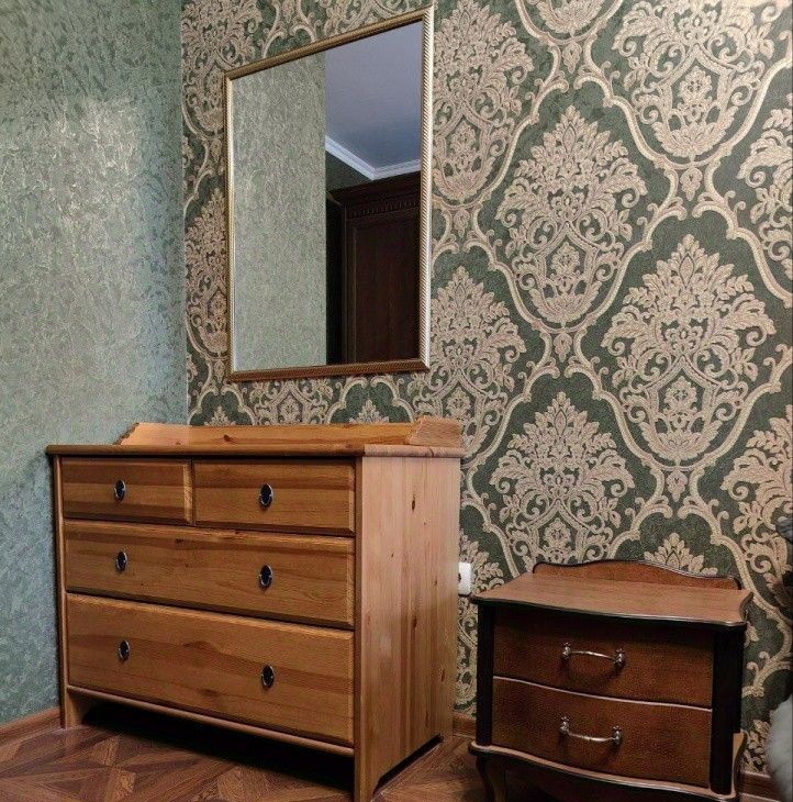 мебель: двуспальная кровать, диван (не раскладывается), шкафы для книг, посуды и одежды, столовая зона, кухонный гарнитур, тумбы, комоды, прихожая