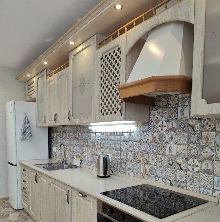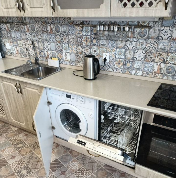 крупная и мелкая бытовая техника: холодильник, стиральная и посудомоечная машины, микроволновая печь, духовой шкаф, варочная поверхность, чайник, утюг, моющий пылесос, водонагреватель, а также ТВ-зона и WiFi роутер.