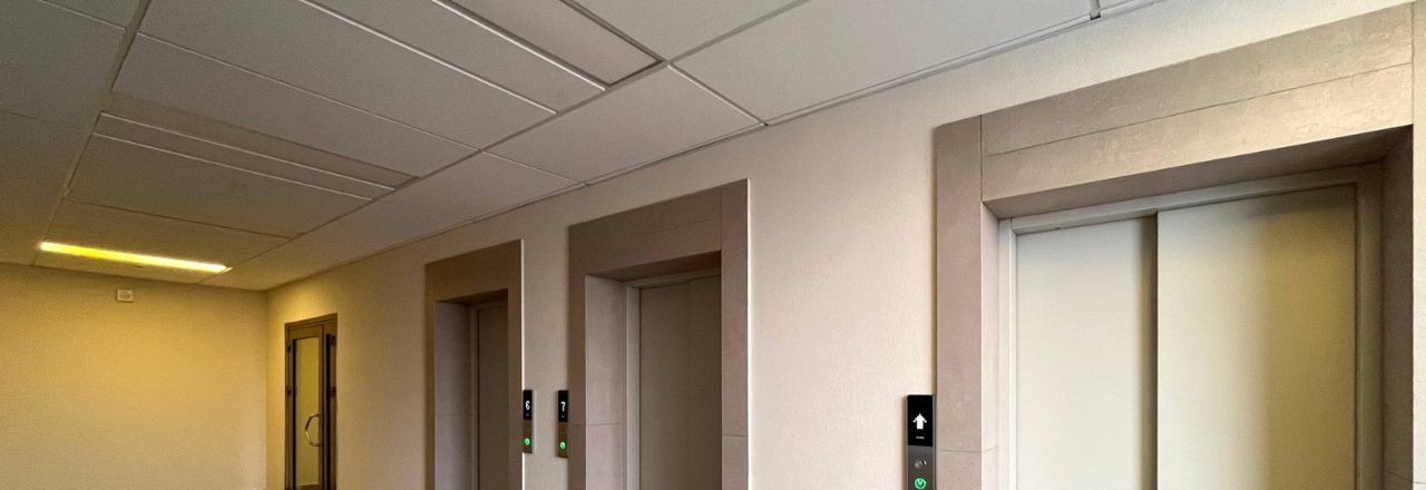 Интерьеры холлов оформлены мрамором, травертином и деревом, на входах стеклянные прозрачные двери. На первом этаже находится ресепшен, меблированные зоны ожидания, колясочная, места для мытья лап домашних животных и колес велосипедов, оборудованные для ухода за детьми санузлы, скоростные бесшумные лифты.
