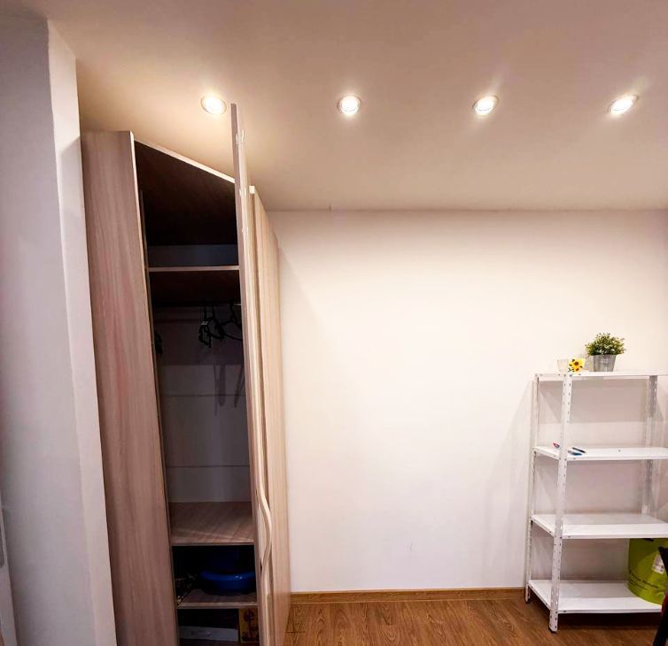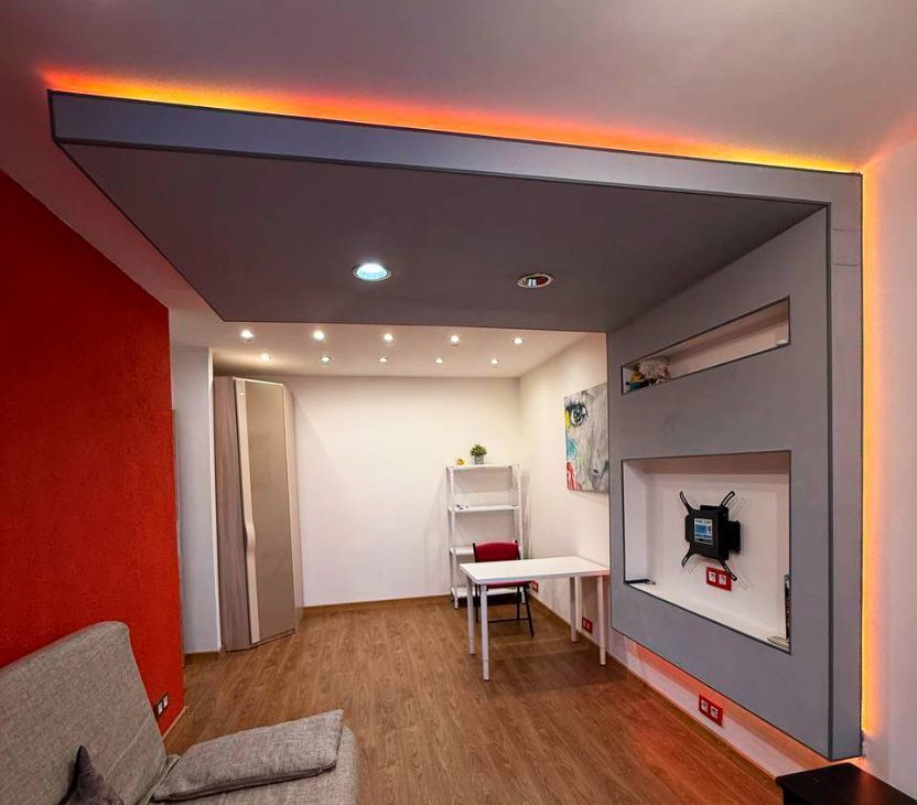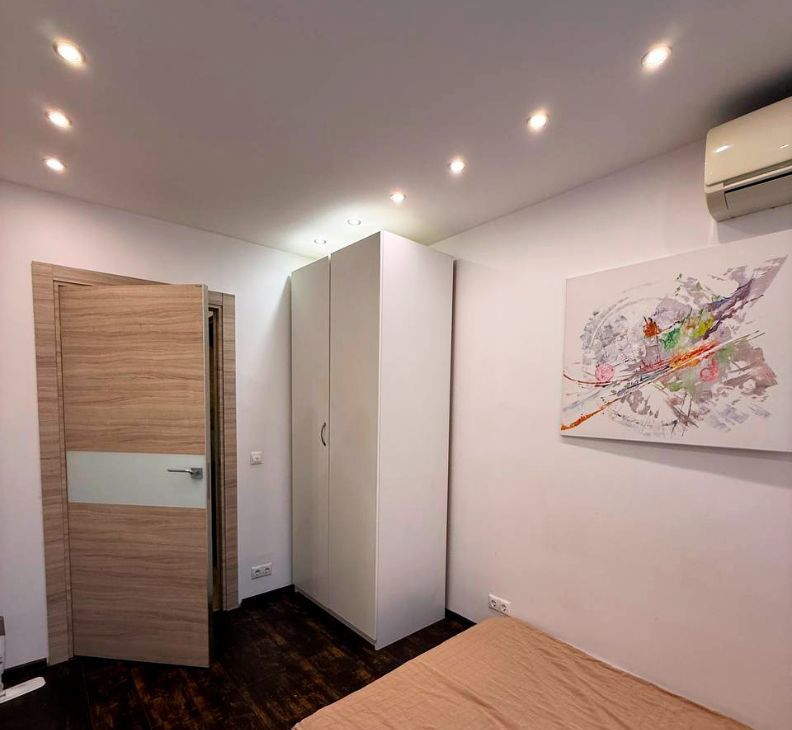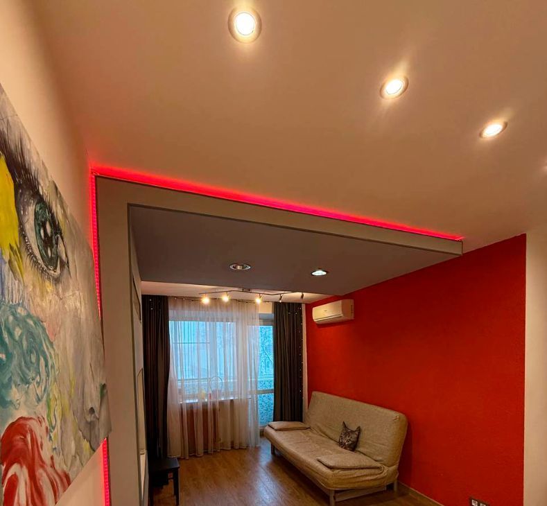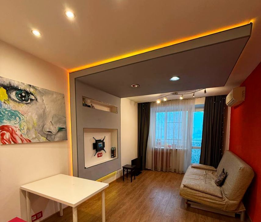 Квартира с дизайнерским ремонтом и правильной атмосферой: аккуратные потолки, современная отделка и свет, который реально задаёт настроение. Есть цветная LED-подсветка ниши (можно менять оттенки) и отдельная LED-подсветка в зоне штор у окна — вечером выглядит особенно уютно.
