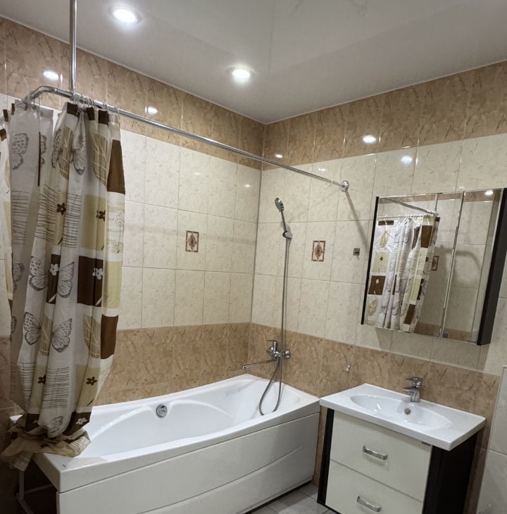 В квартире ламинат, натяжные потолки, обои , санузел кафель - подогрев пола.