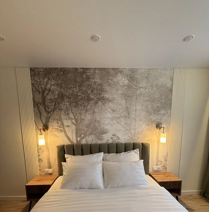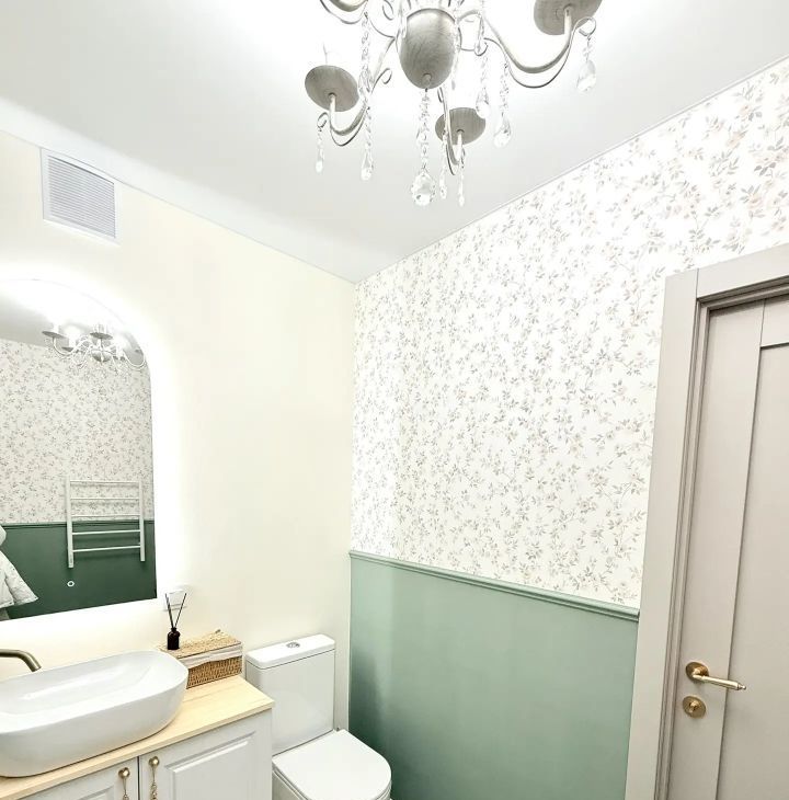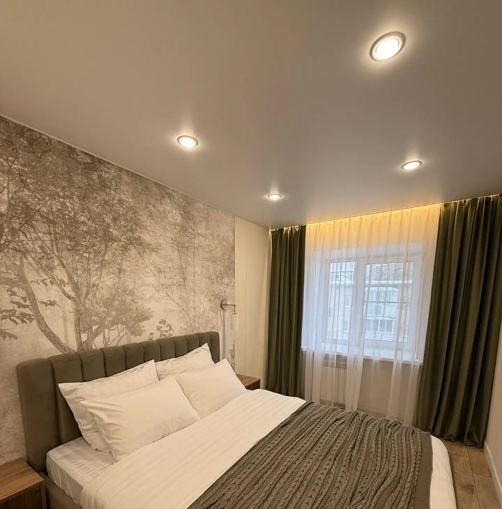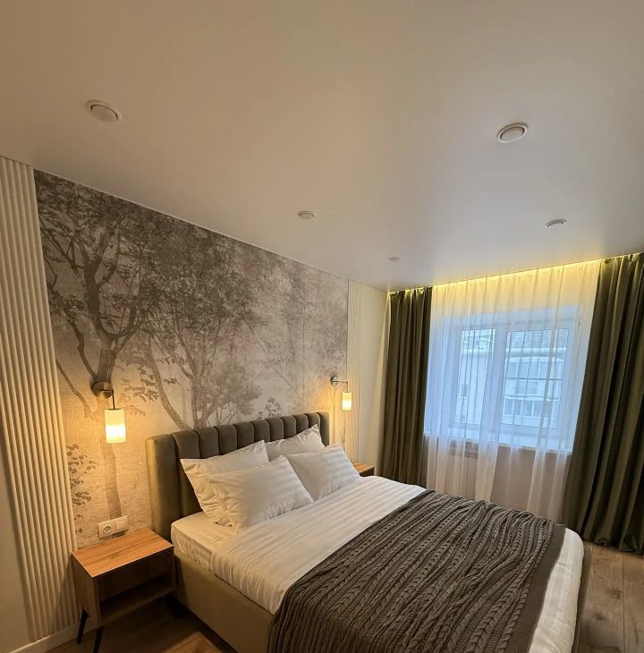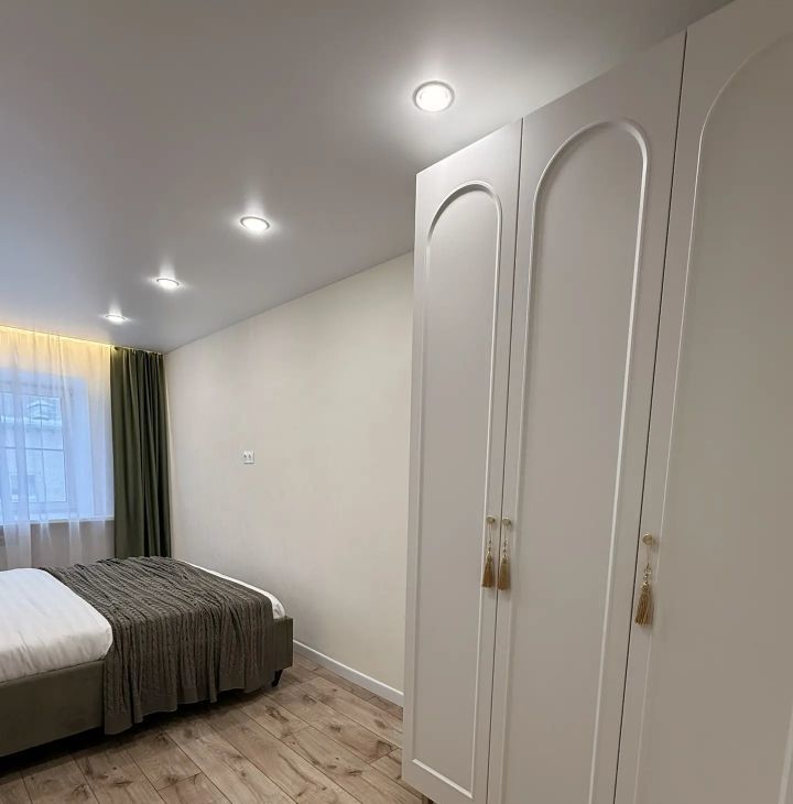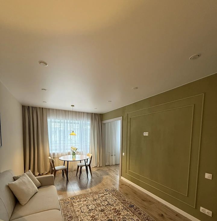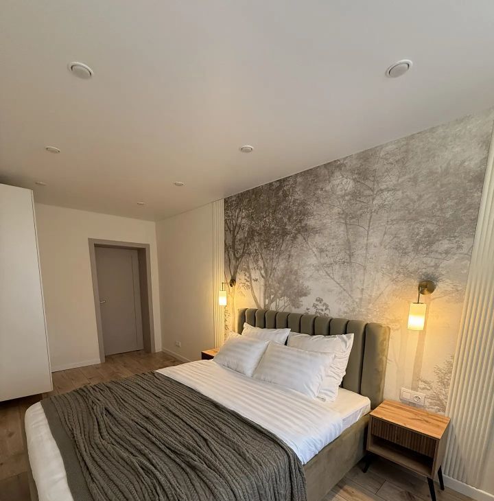 В квартире выполнен дизайнерский ремонт с использованием современных материалов. В гостиной размещен диван, а также обеденная зона, подготовлены выходы розеток на стене под ТВ. В спальне большая кровать, вместительный шкаф, а также персональные прикроватные тумбы с бра.