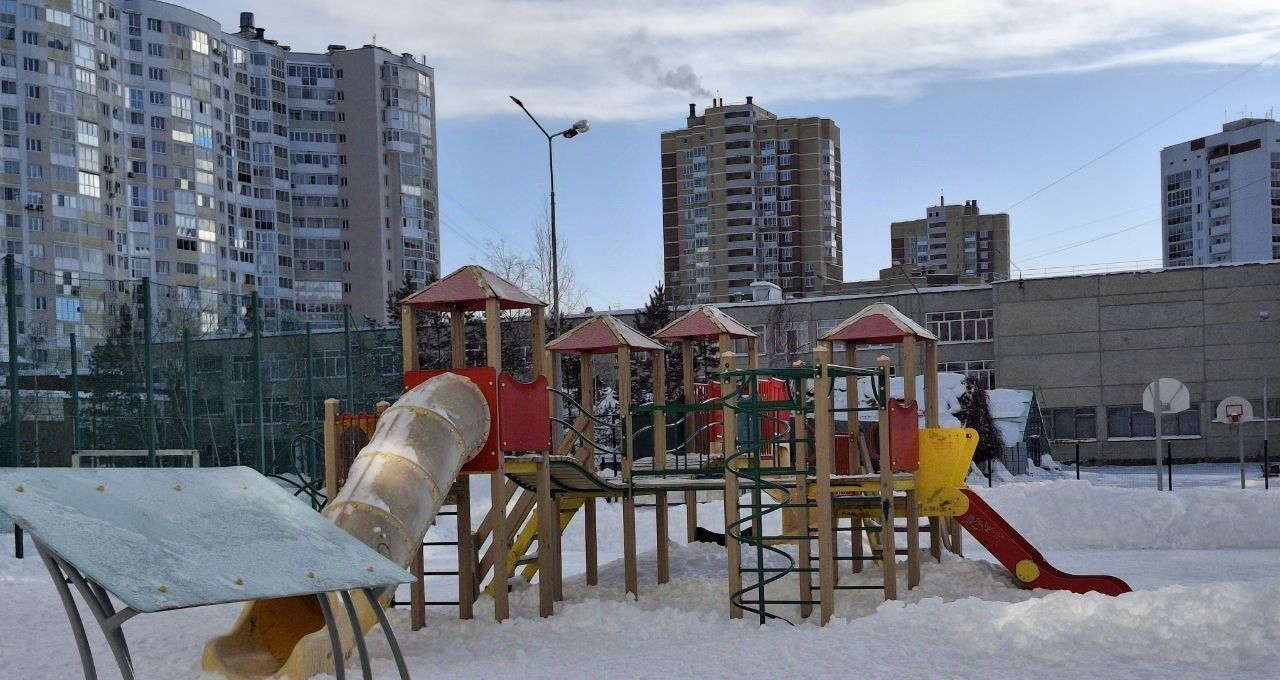 Закрытая территория двора, детская площадка, огражденное футбольное поле и баскетбольная площадка.