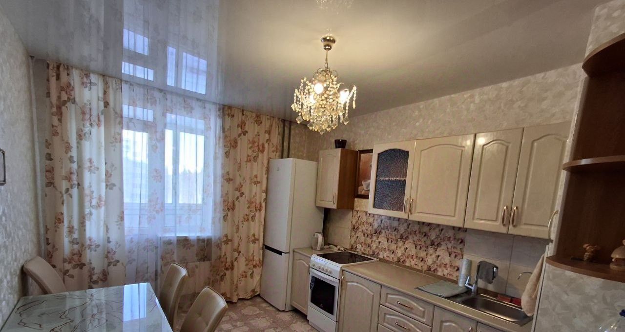 На кухне: гарнитур, холодильник, чайник, обеденная зона (стол и стулья). Балкон из кухни с видом на лесопарк.