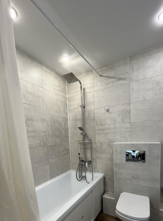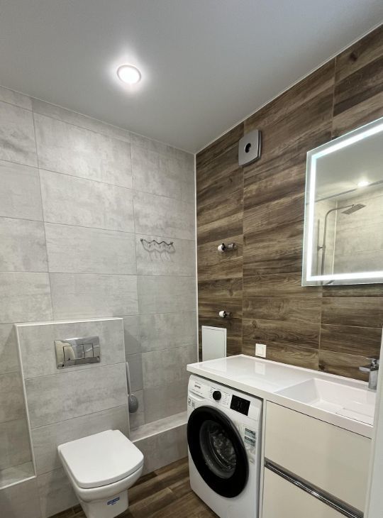 Совмещенный санузел выполнен в современном стиле с качественной отделкой.