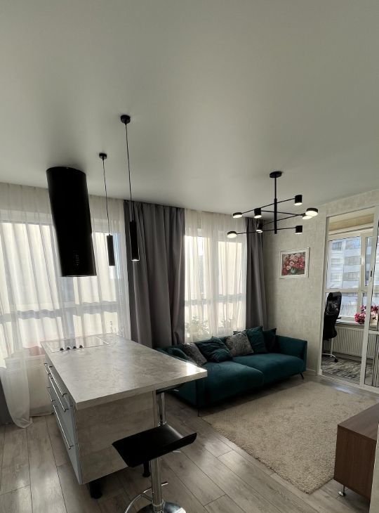 Светлая кухня-гостиная площадью 17 м² оснащена современным кухонным островом.