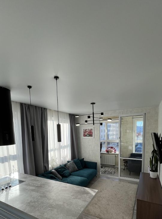 В квартире выполнен качественный ремонт: современные межкомнатные двери, натяжные потолки, напольное покрытие - ламинат, керамогранит в сан - узле.