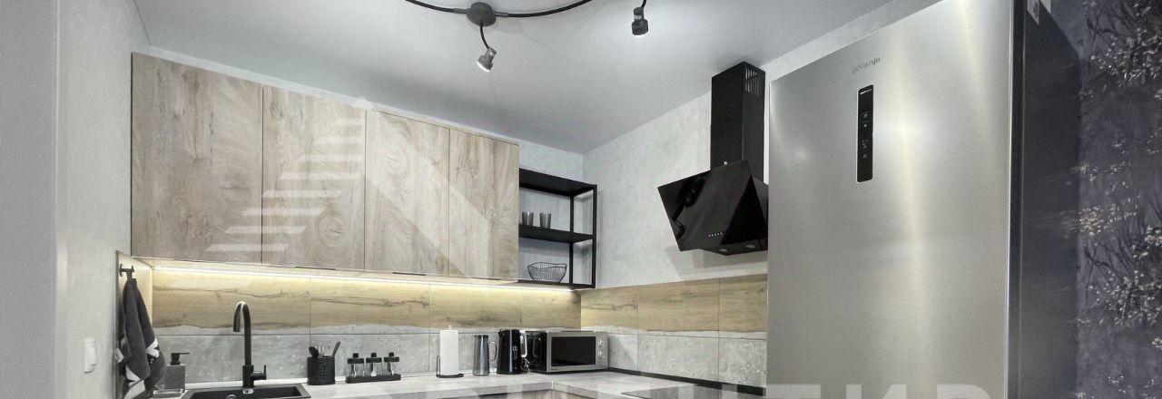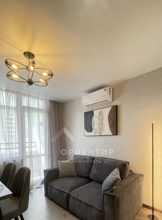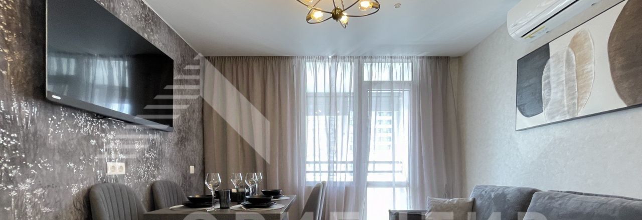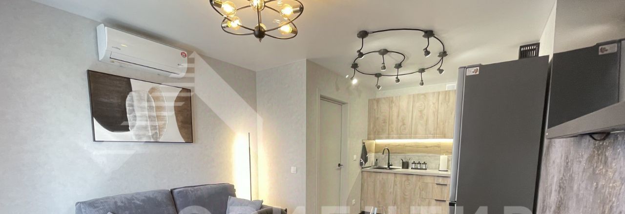 Кухня со встроенной техникой: духовой шкаф, вытяжка, варочная поверхность, посудомоечная машина; холодильник, микроволновая печь, телевизор, диван, двуспальная кровать, 2 вместительных шкафа для хранения вещей, 2 кондиционера.