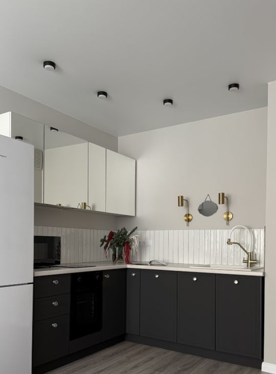 Квартира имеет мебель и технику для жизни: кровать двухспальная, диван, кухонный гарнитур с встроенной техникой(посудомоечная машина, варочная панель, холодильник, вытяжка, чайник, микроволновка, духовка) стол и 2 стула, шкаф, гардеробная, стиральная машина.
