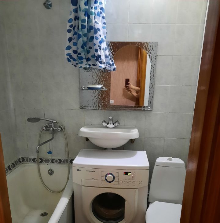 Из мебели остается кухонный гарнитур, стол и табуретки; шкаф-купе с зеркальными дверцами, комод и одна кровать, настенная вешалка в прихожей. Из техники - стиральная машина.