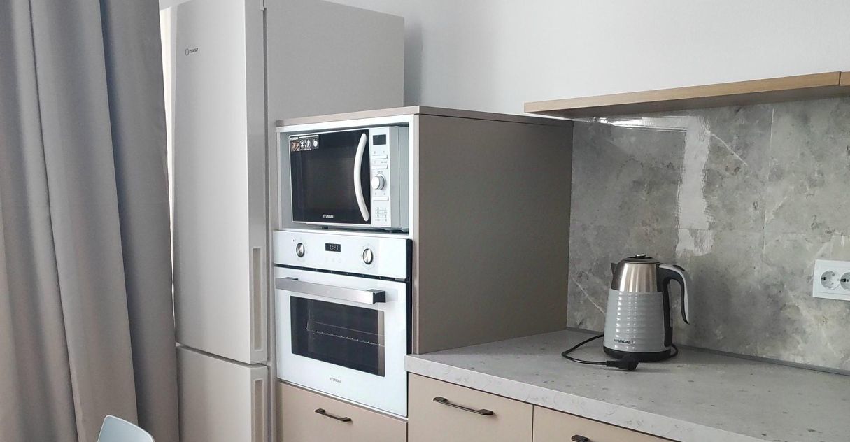 Кухня-Гостиная: техника (холодильник, духовка, варочная панель, микроволновая печь, посудомойка,чайник). Всё новое, блестит. Телевизор, раскладывающийся диван.