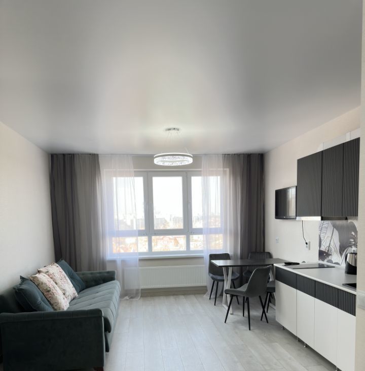 Просторная гостиная объединена с кухней, что создает ощущение открытого пространства. Из окон открывается вид на городские пейзажи.