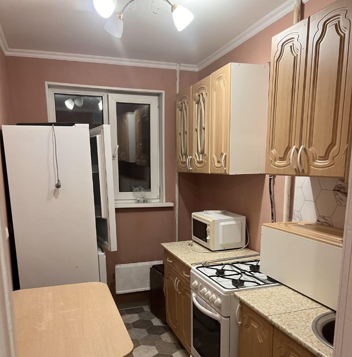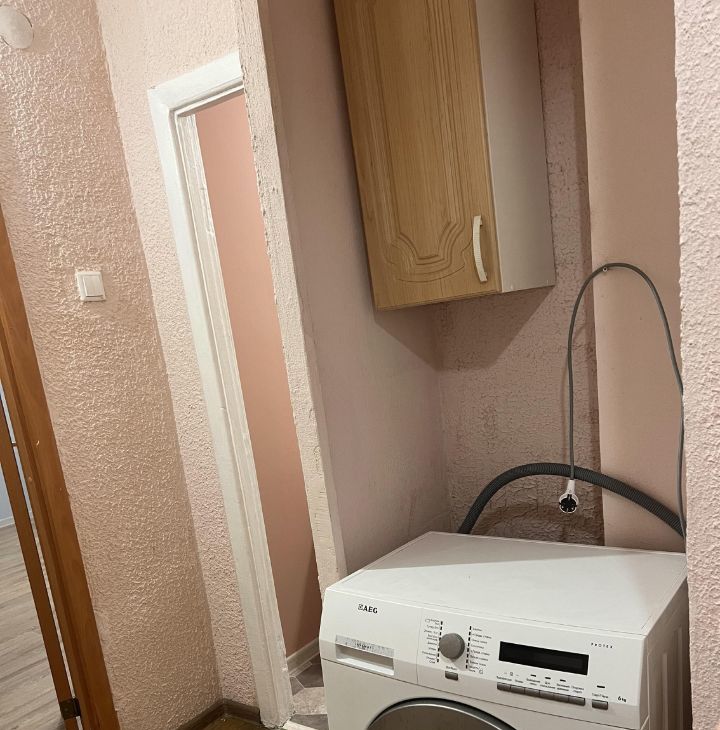 Квартира полностью готова к проживанию: есть стиральная машина, микроволновая печь, холодильник, удобный диван, большой шкаф-купе, а также отдельный шкаф для верхней одежды в коридоре. На кухне — газ.