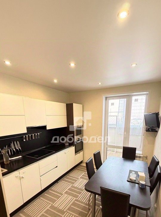Кухня: кухонный гарнитур, оснащен встроенными варочной поверхностью и духовым шкафом, СВЧ -печь, посудомоечной машиной, холодильник, ТВ, стол, стулья, вся необходимая посуда.
