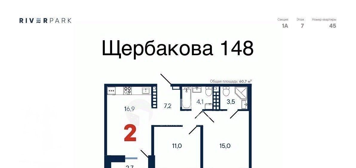 Сдаётся в аренду 2-х комнатная квартира - 61 кв. метр, по адресу: ул. Щербакова, д. 148, ЖК "RIVER PARK".