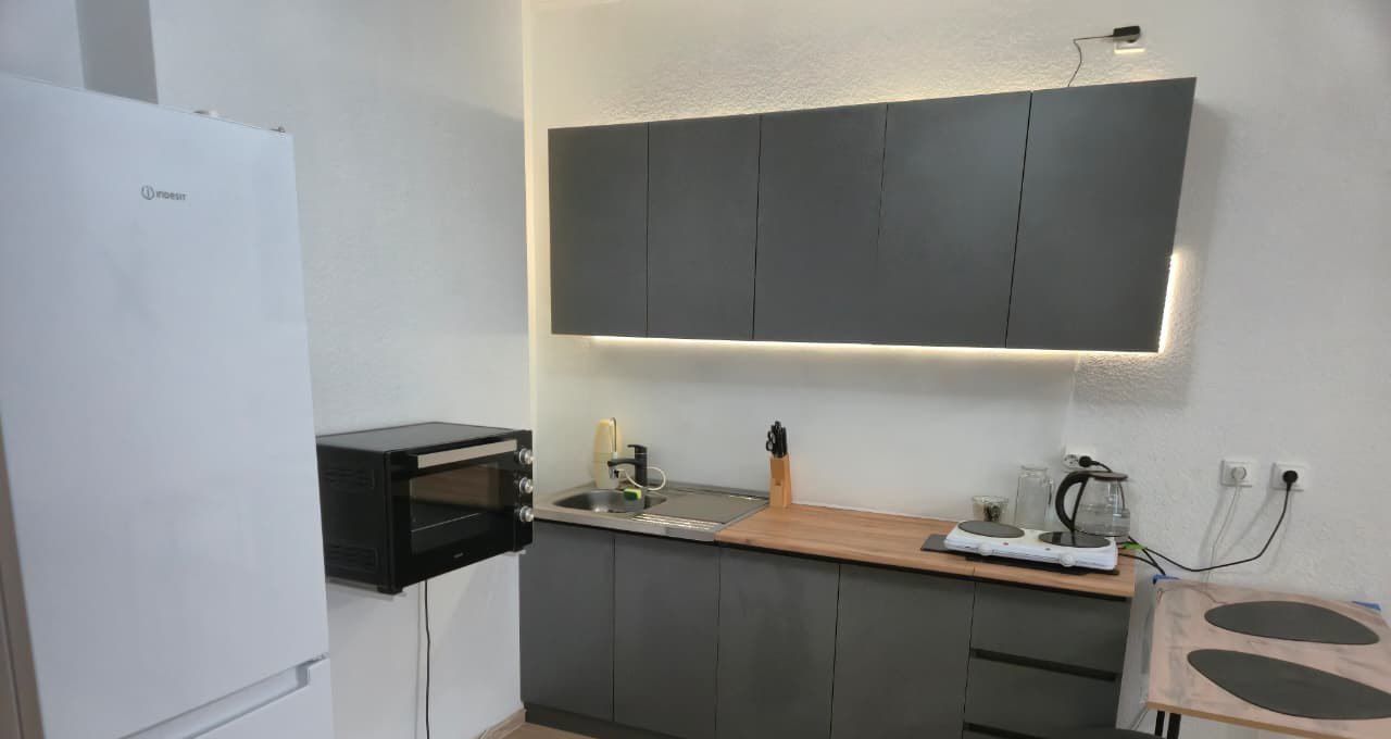 Квартира оборудована всем необходимым для комфортного проживания: Кухонный гарнитур, холодильник, плита двухкомфорочная, обеденный стол, стулья, диван, стиральная машина, кровать, письменный стол, стул, шкаф,
