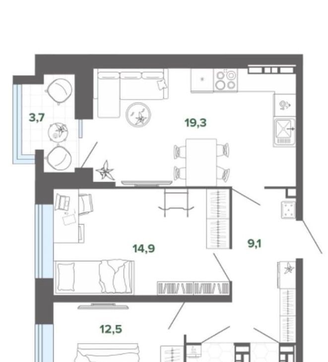 •Кухня-гостинная 19,3 кв.м. + лоджия 3,7 кв.м.