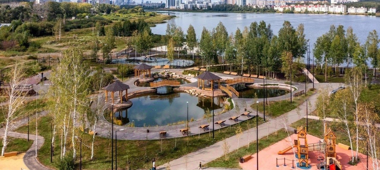 •Собственный парк с пляжем на территории Нижне-Исетского пруда. В парке имеется спортивная площадка с тренажерами, баскетбольное и футбольное поля, плащадка для собак, скейт-парк, различные детские площадки, искусственное озеро с карпами, пирс (летом там сдаются сапы и лодки в аренду для плавания по исети), кофейня