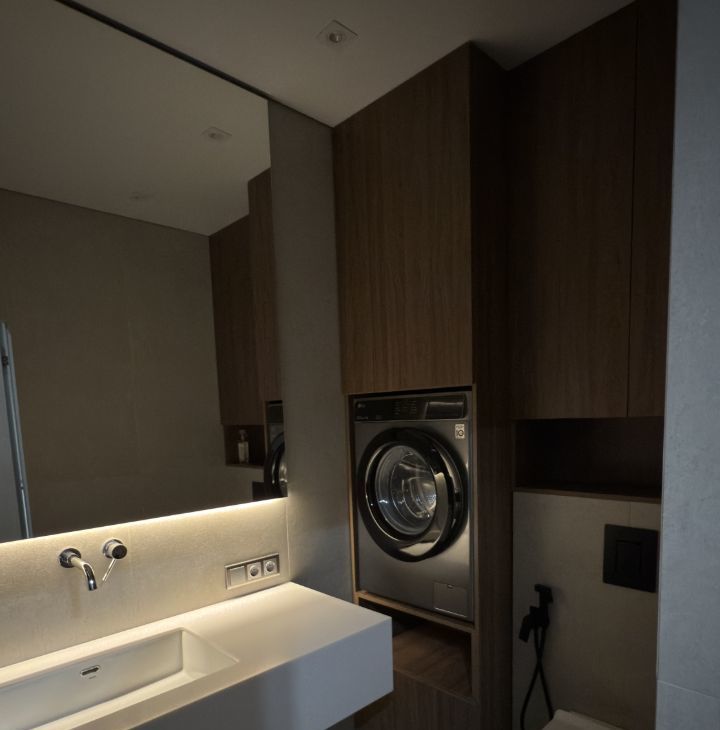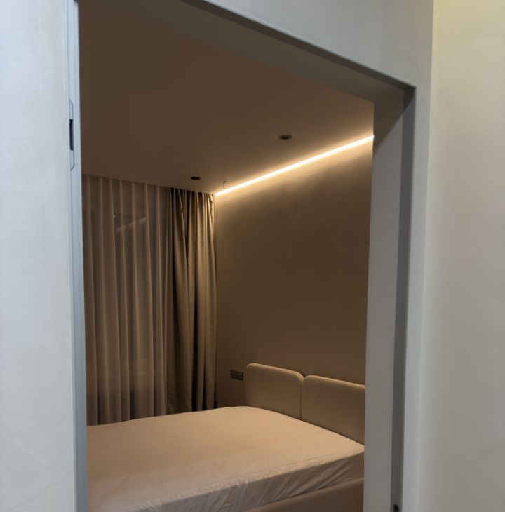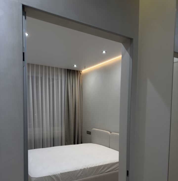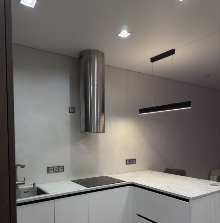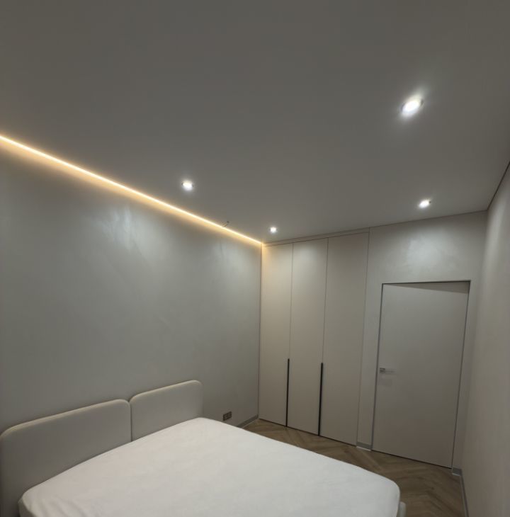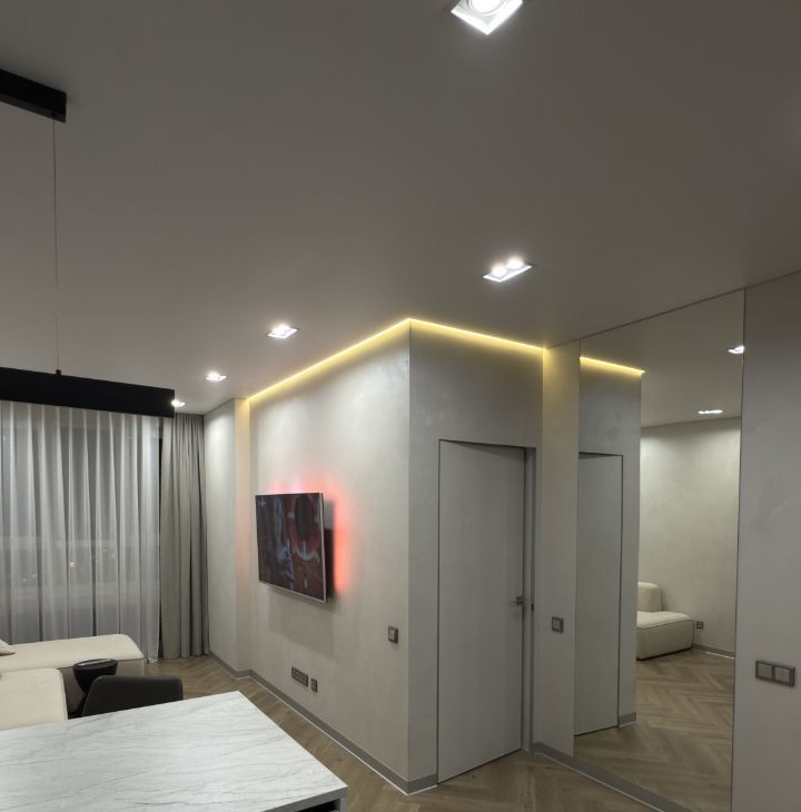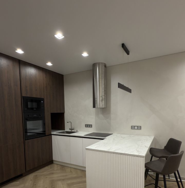В ремонте квартиры использовались только качественные материалы, на стенах декоративная штукатурка, мебель индивидуально изготовления, встроенная техника, модульный диван, разные сценарии освещения в каждой комнате и су.