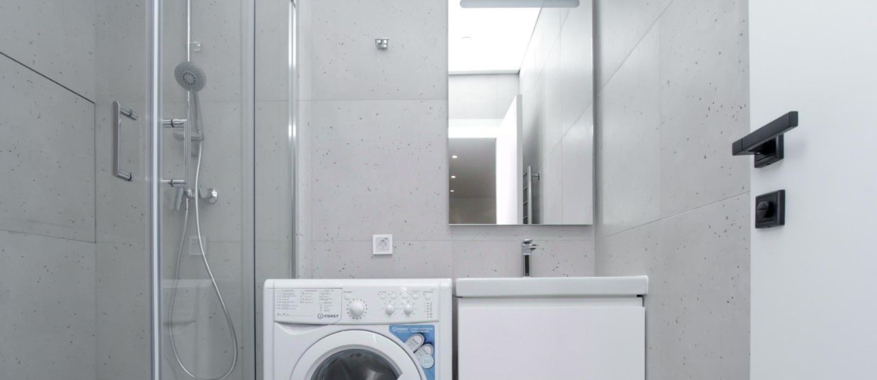 В студии совмещенный санузел с душем, стиральной машиной, а также раковиной с зеркальной подсветкой.