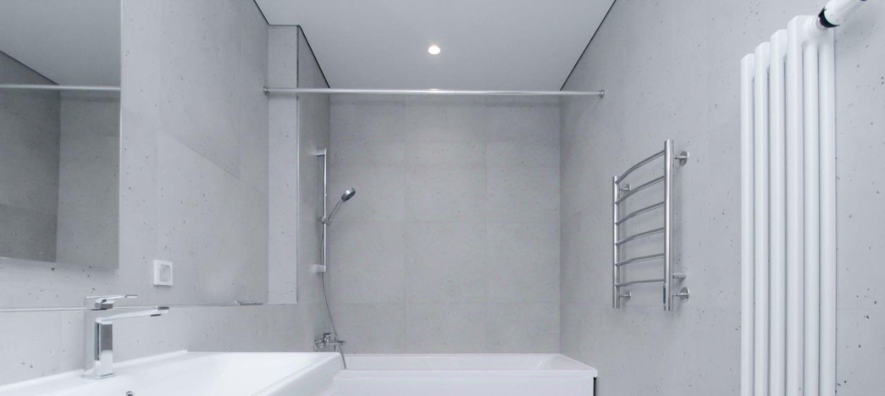 В студии совмещенный санузел с ванной, а также раковиной с зеркальной подсветкой.