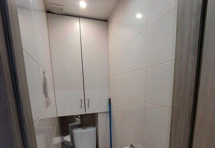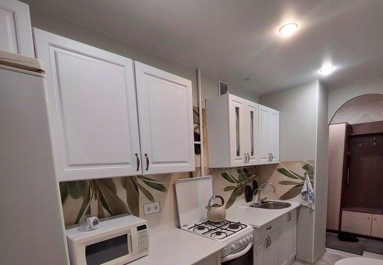 В квартире есть вся необходимая мебель и техника: кухонный гарнитур, плита, холодильник, микроволновая печь, обеденный стол, двуспальная кровать, шкафы для хранения, диван, телевизор, стиральная машина. Много мест для хранения вещей. Чистый подъезд, спокойные соседи.