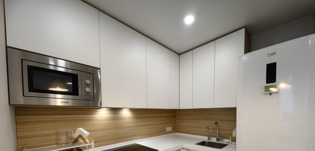 - кухонный гарнитур, включающий посудомоечную машину, электроплиту и духовку Bosch, встроенную микроволновку Gorenje, холодильник beco, измельчитель отходов inSinkerator, вытяжка Jetair.