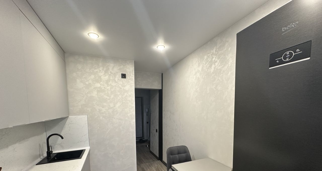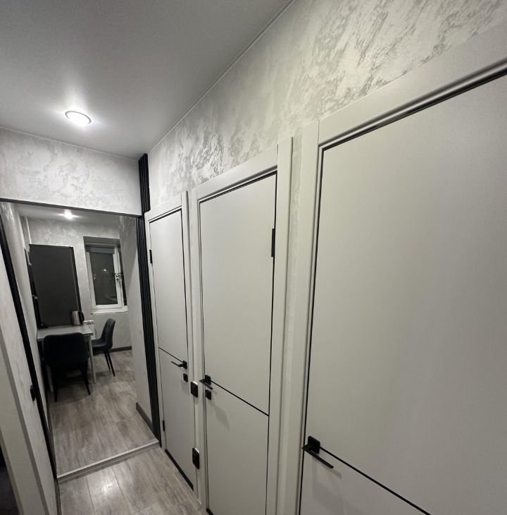 Кухня, коридор, зал, спальня- нанесена водоимульсионная декор штукатурка в три слоя, с возможностью мытья и окрашивания в другие цвета.