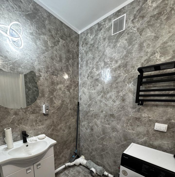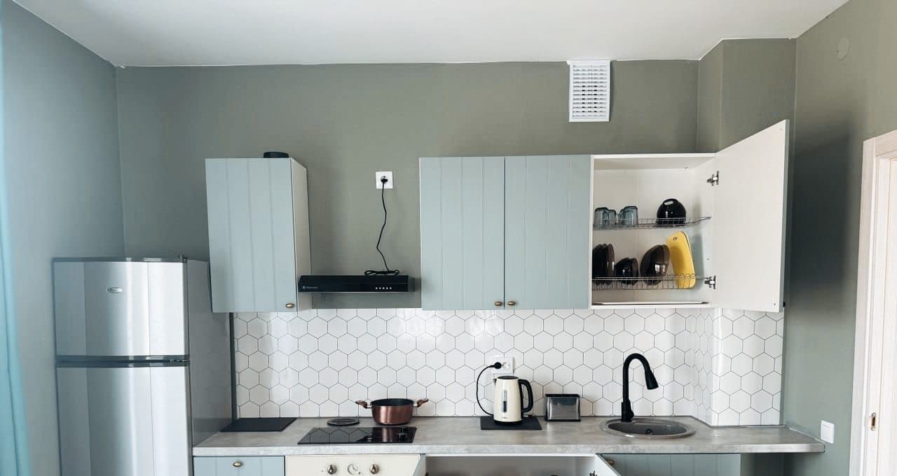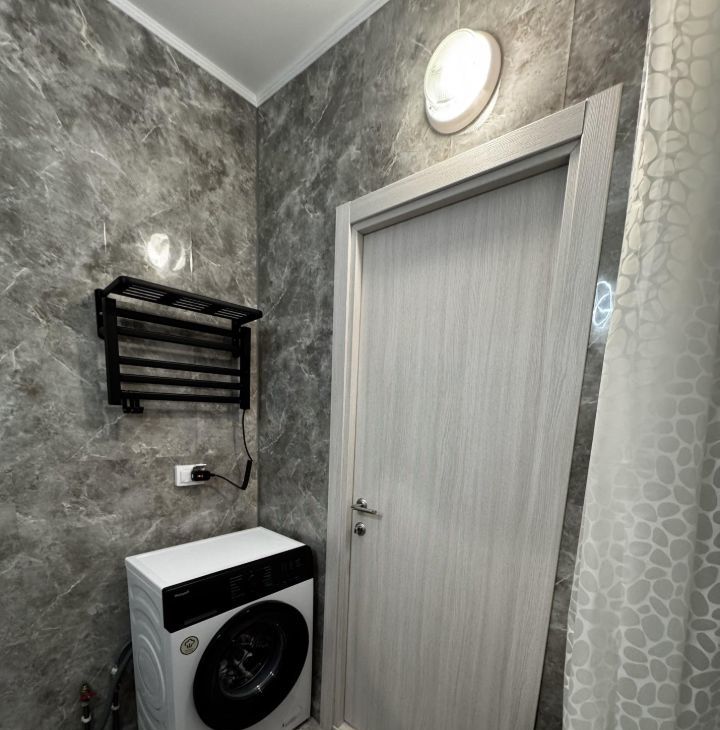 - Техника для вашего удобства: стиральная машина, полотенцесушитель, холодильник, электрическая варочная панель, духовая печь, телевизор и чайник.