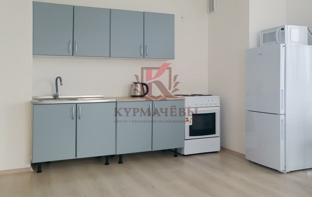 Кухня-гостиная оборудована техникой: электрическая плита с духовкой, двухкамерный холодильник, чайник. Компактный кухонный гарнитур. Имеется обеденный стол и стулья.