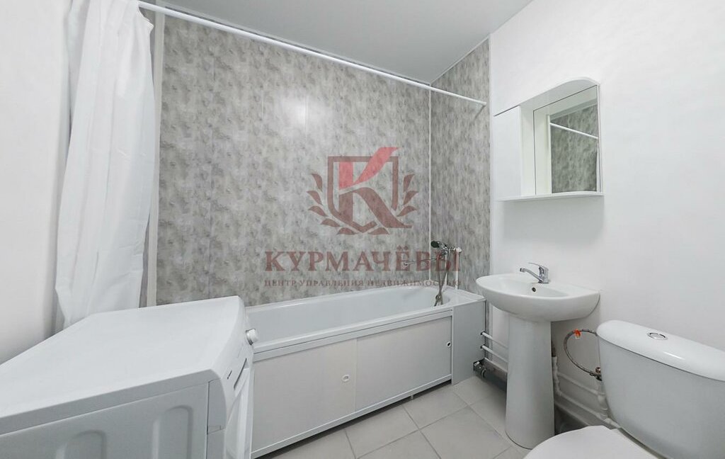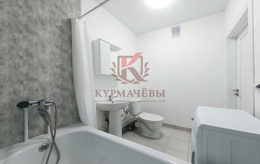 - В ванной комнате: ванная со смесителем и лейкой, карниз со шторкой, унитаз, настенное зеркало, раковина со смесителем и пьедесталом, стиральная машинка.