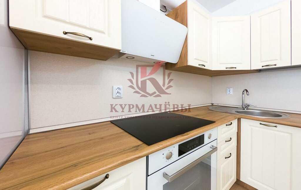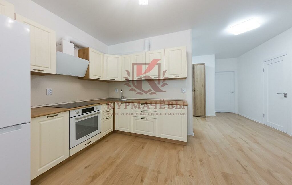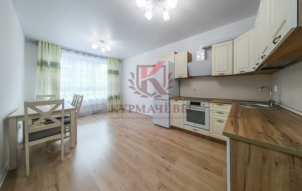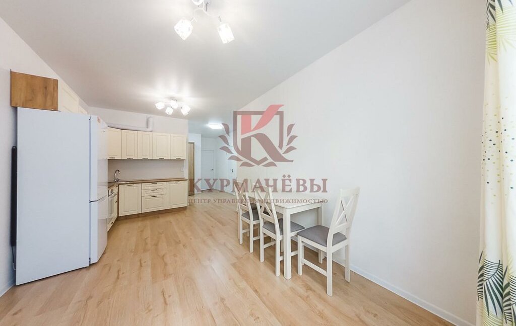 - В кухне-гостиной: кухонный гарнитур, электрическая варочная поверхность на 4 конфорки, духовой шкаф, вытяжка, холодильник, обеденный стол со стульями.