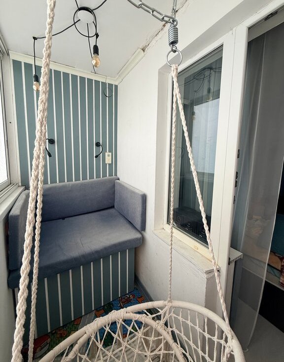 На балконе сделан косметический ремонт - оборудована летняя зона отдыха с подвесным креслом-качелью и мягким диванчиком.