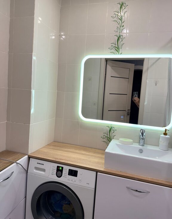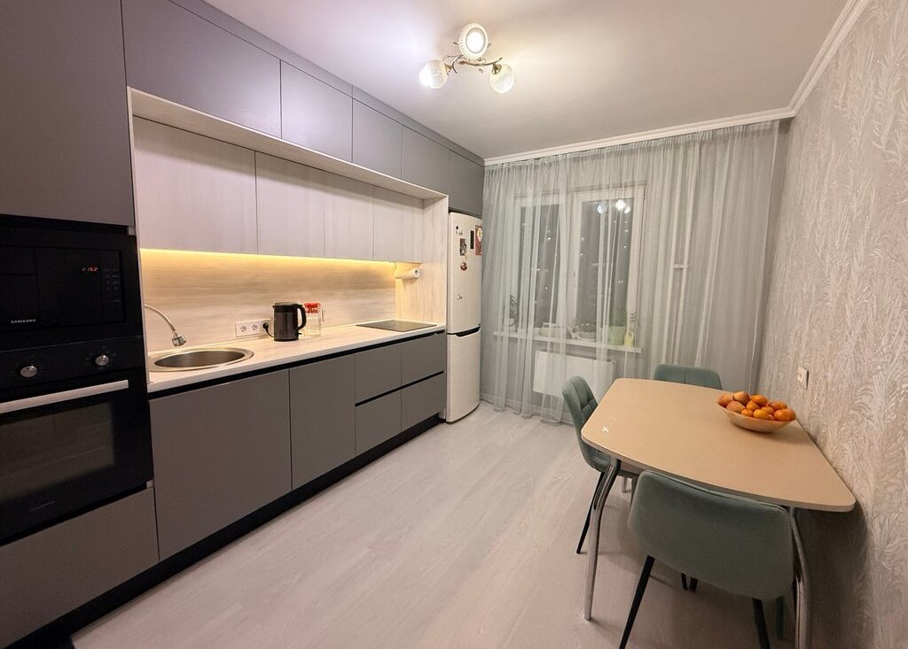 Будущим владельцам остается новый встроенный кухонный гарнитур с встраиваемой техникой: духовой шкаф, микроволновая печь, посудомоечная машина, индукционная варочная панель, вытяжка.